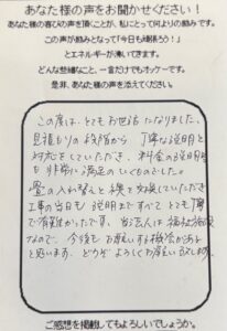 見積もりの段階から丁寧な説明と対応をして頂き、料金等の説明も非常に満足のいくものでした。